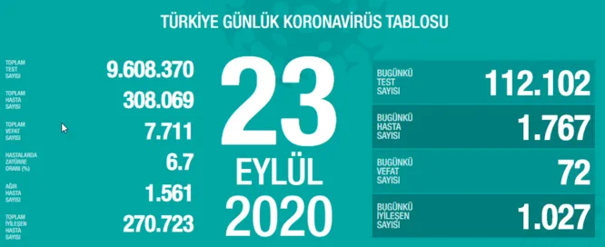 Tabloya göre; Türkiye’de son 24 saatte 112 bin 102 Kovid-19 testi yapıldı, 1767 kişiye hastalık tanısı konuldu. Son 24 saatte 72 kişi Kovid-19 nedeniyle hayatını kaybetti, ağır hasta sayısı 1561 oldu. Son 24 saatte 1261 kişinin Kovid-19 tedavisinin tamamlanmasıyla iyileşenlerin sayısı 270 bin 723’e yükseldi.